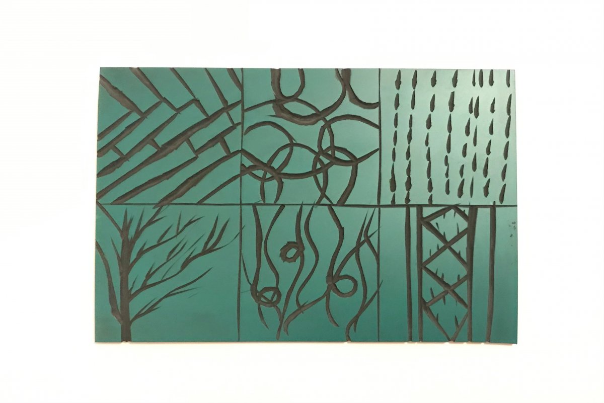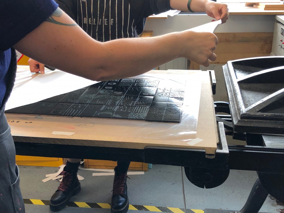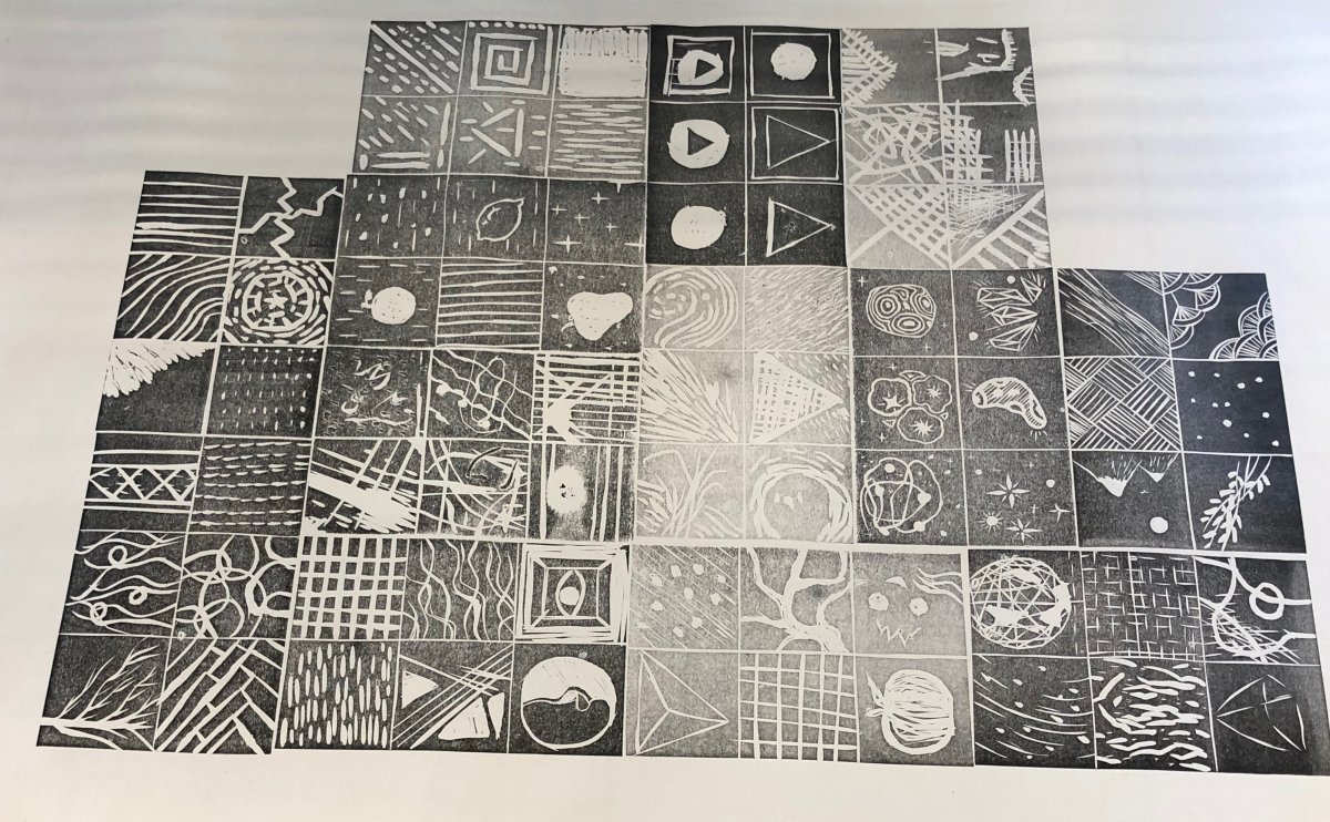 The final stage involved piecing together everyones linoleum bases onto the press to create one large print. It was interesting to see everyones designs collectively on one large piece of paper. It meant that you could see areas of small indentation and large and where the ink had really taken hold well on the print.